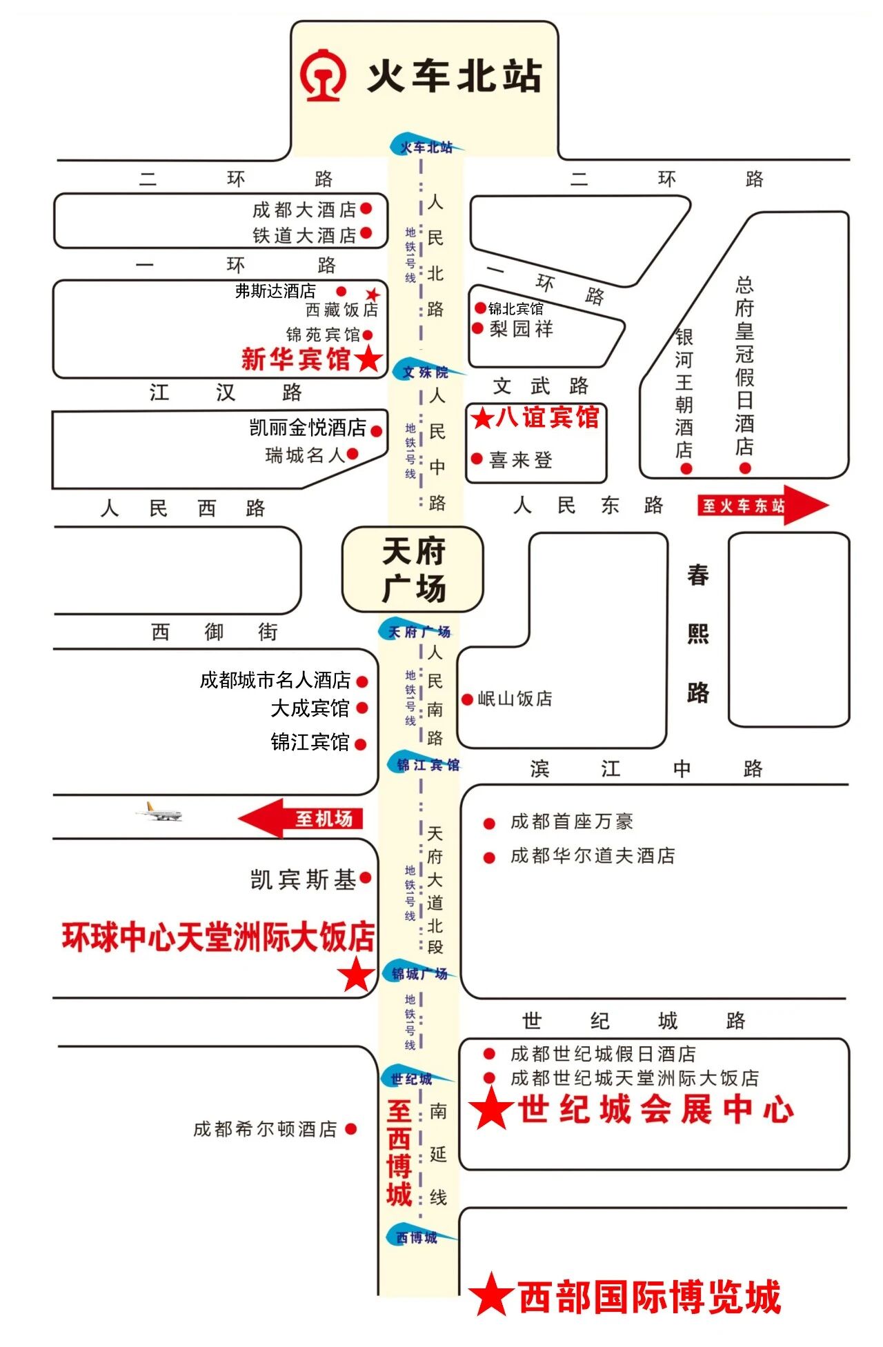 3.从成都双流机场出发:乘坐地铁3号线在省体育馆站转乘地铁1号线,然后同**方案,直达西博城或世纪城。